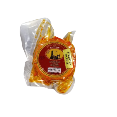 Mezcla de leches de vaca (mín. 40%) y cabra (mín. 25%). Curado con pimentón picante (no apto para paladares sencillos). Piezas al vacío de 400-450 g aproximadamente.