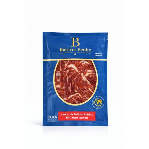 Los sobres de jamón de bellota 50% raza ibérica cortado a cuchillo de Ibéricos Benito representan la máxima expresión de la tradición ibérica. Procedente de cerdos criados en libertad y alimentados con bellotas durante la montanera, este jamón ofrece una calidad excepcional y un perfil organoléptico único.